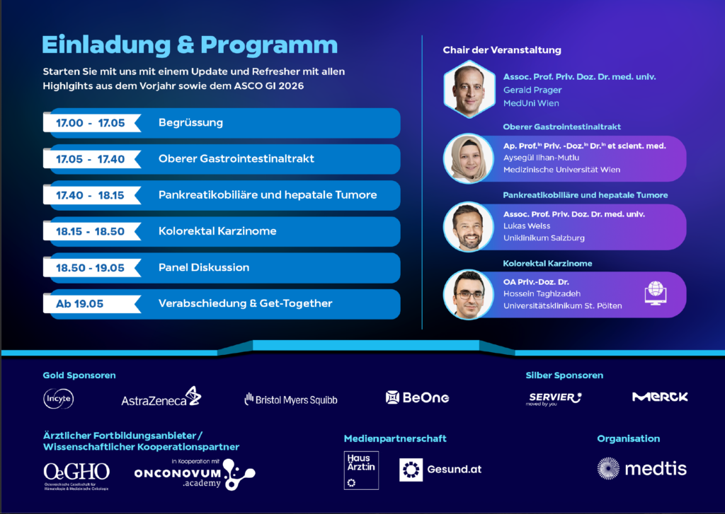 Ich freue mich, euch herzlich zum «3. Connected in GI Cancer 2026» Event einzuladen – einem kompakten Erfahrungsaustausch über praxisrelevante Highlights aus internationalen Kongressen wie ESMO, ASCO, ASCO GI, WCGIC und Publikationen.