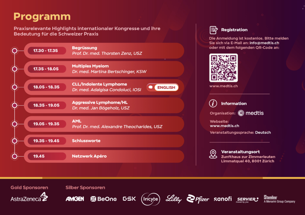 Für diese Veranstaltung wurden 3 Credits der Schweizerischen Gesellschaft für Hämatologie (SGH) bestätigt.
